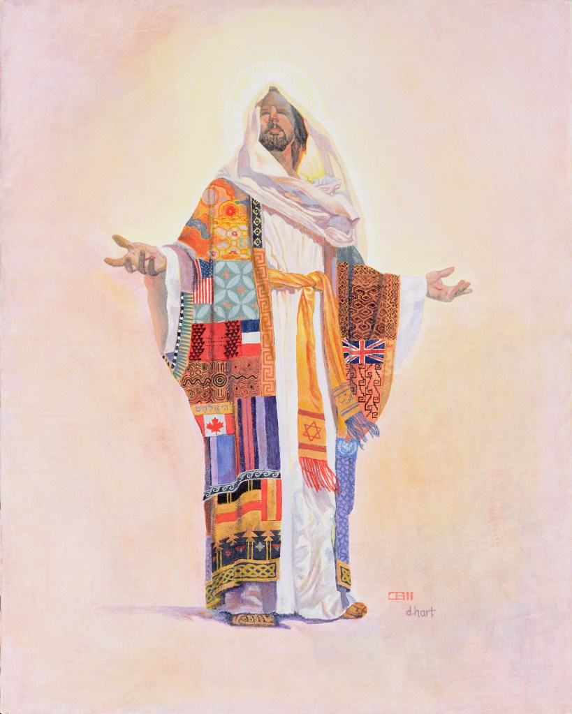 Since this was for me and not for sale, I copied the original artist’s work. For this, I included his signature in my painting. The figure portrays Jesus, and the colors and patterns in his garments represent the people and nations of the world.